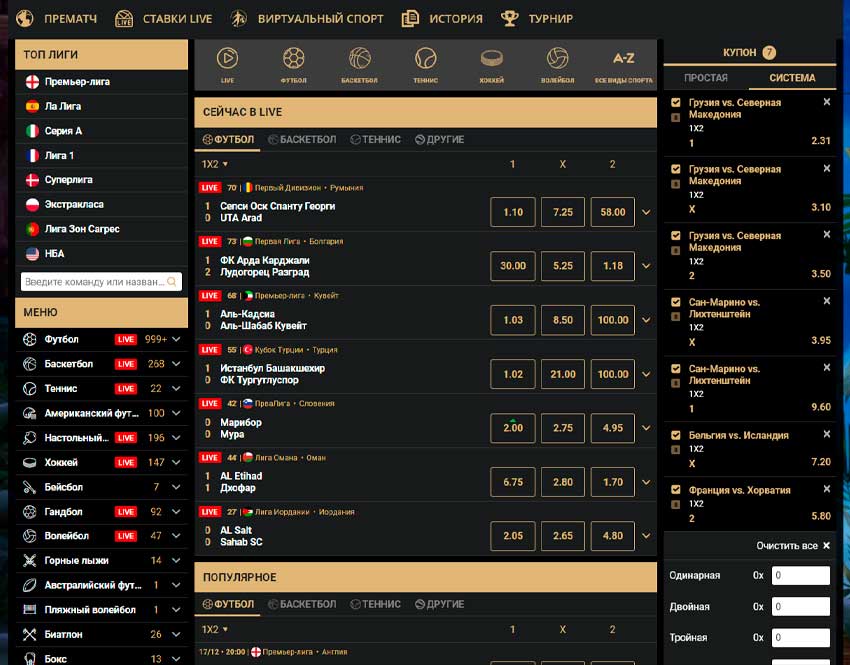 Отделение «Спорт» посвящено предматчевым пари и ставкам в реальном времени. Деньги можно попытаться выиграть, угадав исход или счёт состязаний с разных уголков Земли, в том числе киберспортивных развлечений. К сожалению временно закрыт.