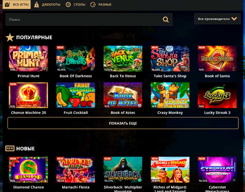 Раздел «Слоты», куда заходят все игроманы, предпочитающие «однорукие» развлечения, подразделяется на интуитивно понятные категории. Здесь можно найти новые азартные забавы, популярные у клиентов игры, джекпот-машины, необычные автоматы и многое другое – тысячи наименований от трёх десятков производителей.