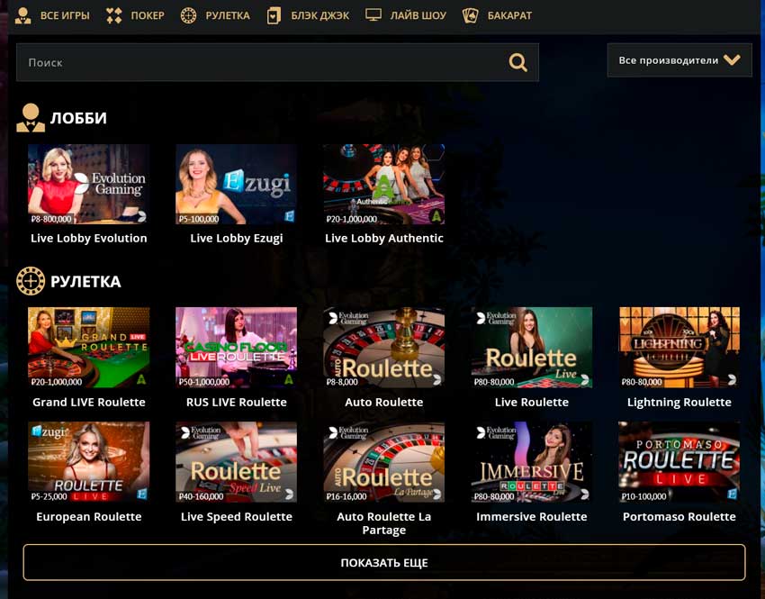 Лобби меню казино позволяет выбирать между такими видео увеселениями, как рулетка, покер, баккара и блэкджек. При желании, в «Риобете» вы можете наблюдать за реальными раздачами и участвовать в них, как в настоящих наземных казино в разделе Live Casino.