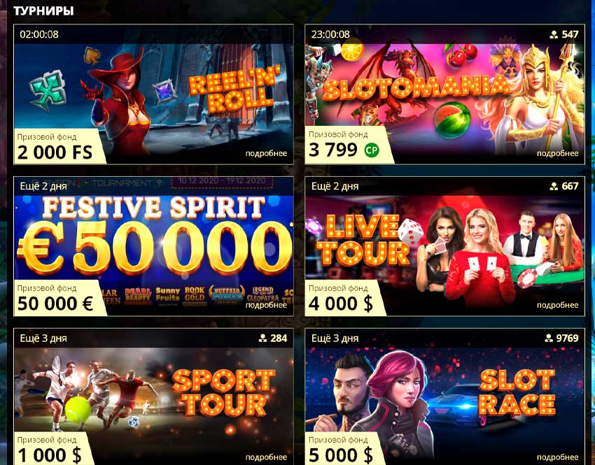 Нажав по пункту «Турниры», вы перейдёте к списку закончившихся и идущих внутренних и сетевых соревнований казино. Для участия в некоторых нужно обладать особым VIP-статусом, в другие проход доступен просто за деньги или даже за так.